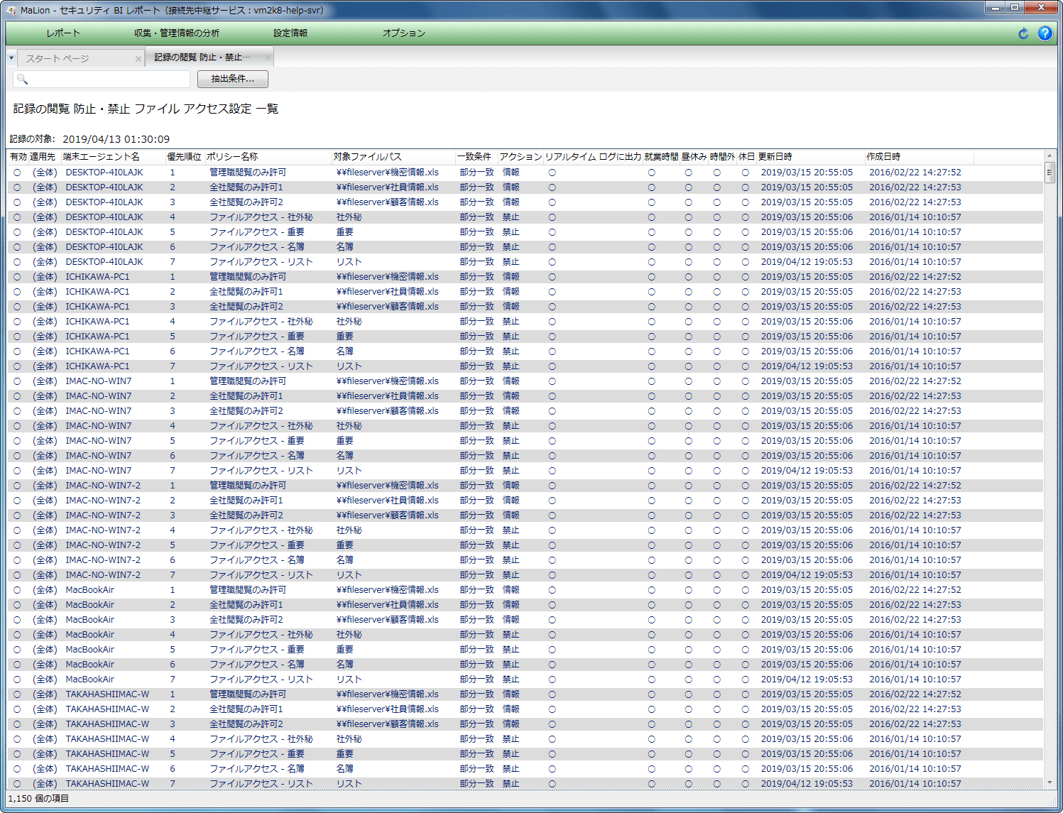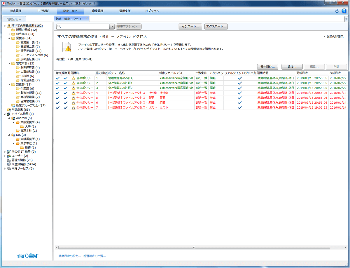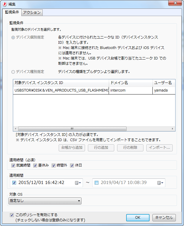 セキュリティポリシーに沿って読み込みのみ許可したり、あるいはすべての操作を制限したりと各PC上でのデバイス利用を制御できます。