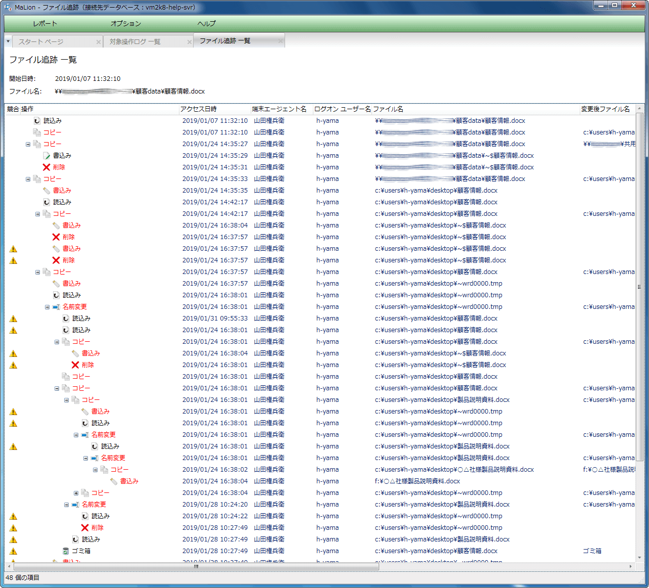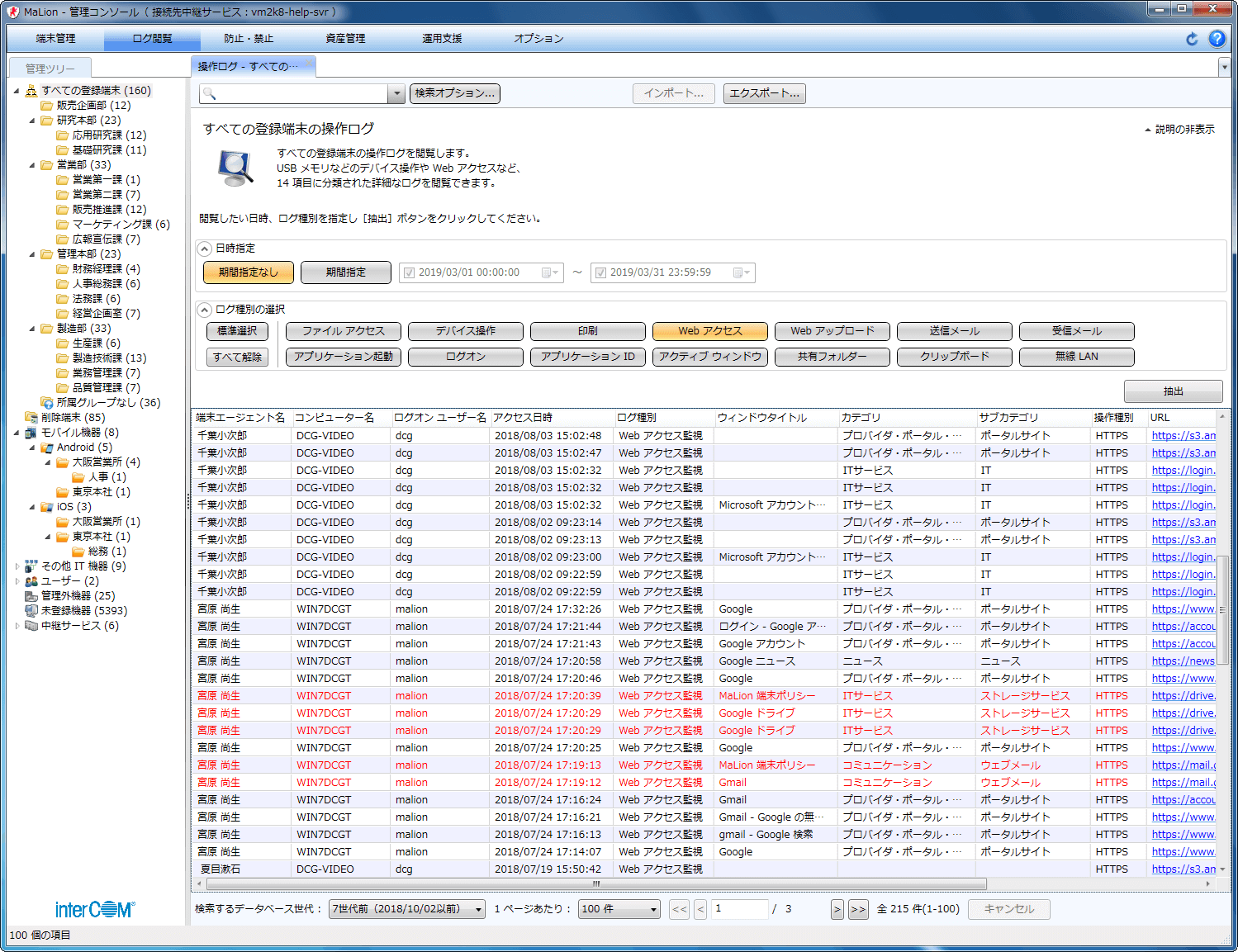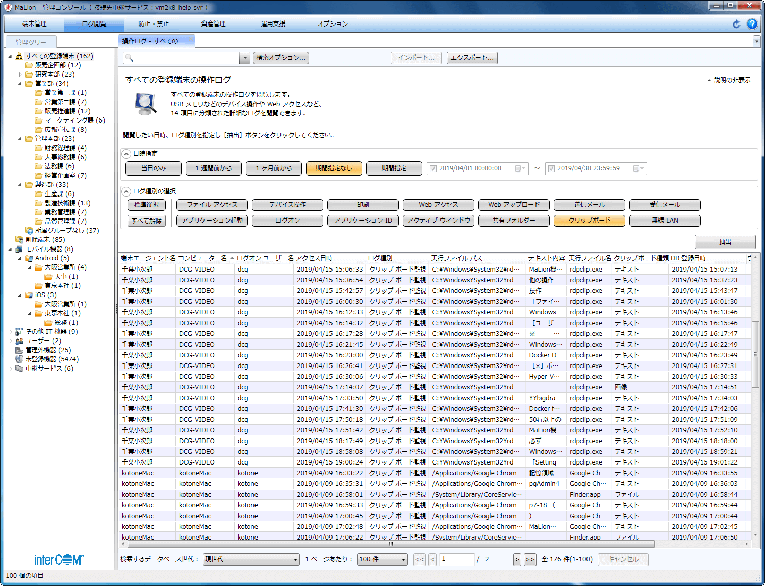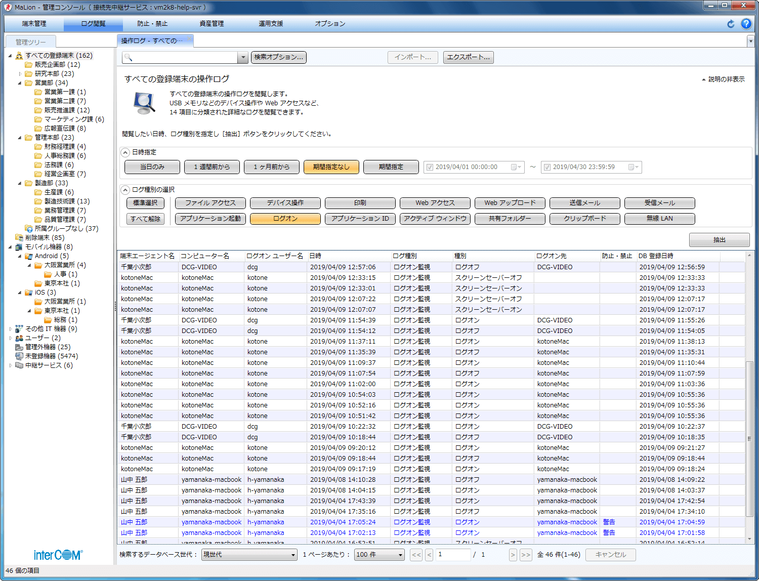 - 膨大な端末操作ログの中から、見たい種別を選択するだけで、関連するログが一覧表示できます。