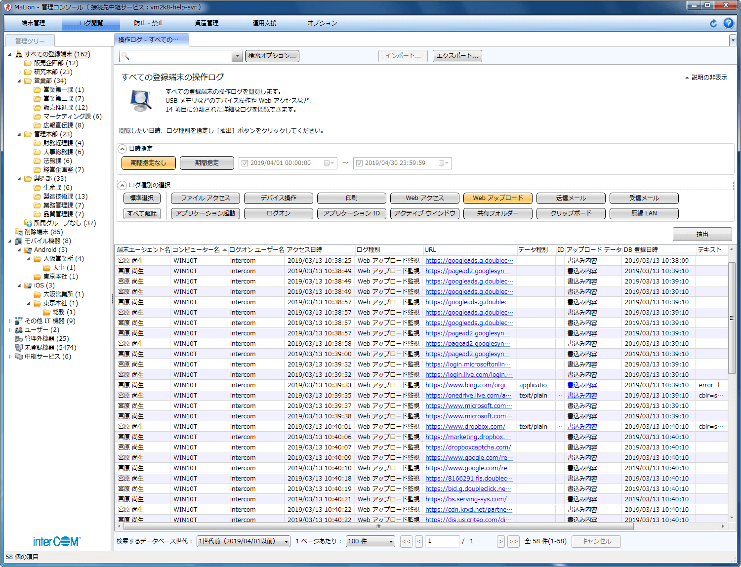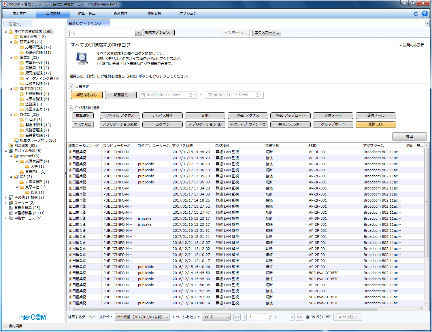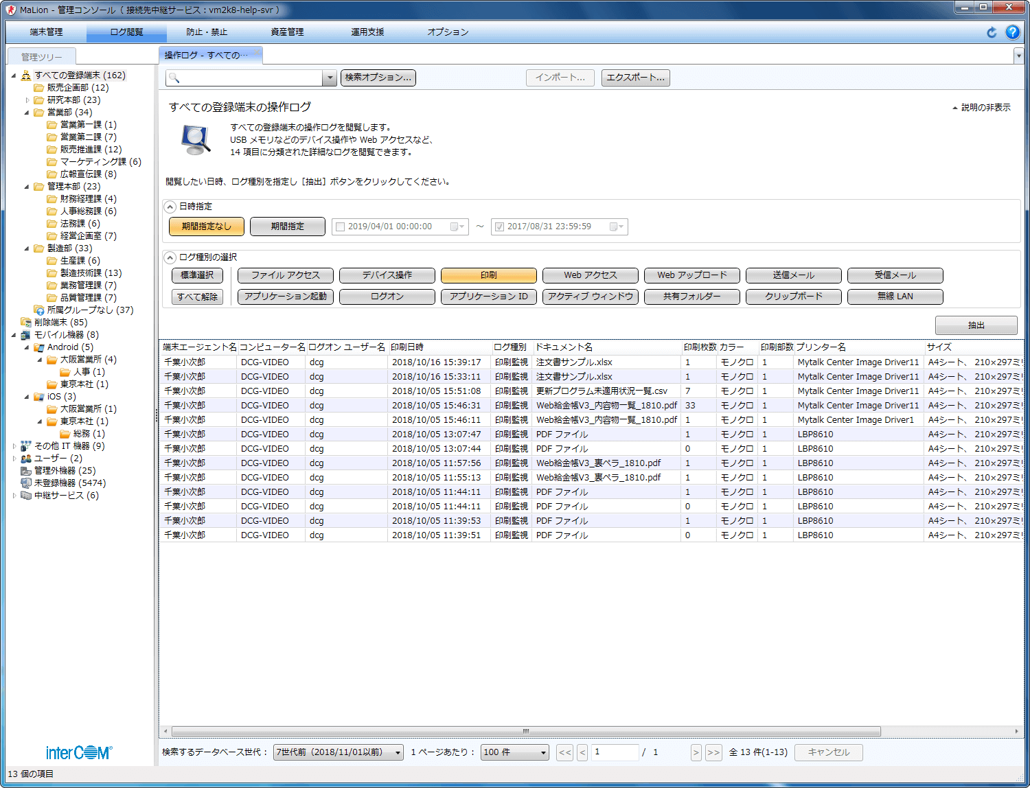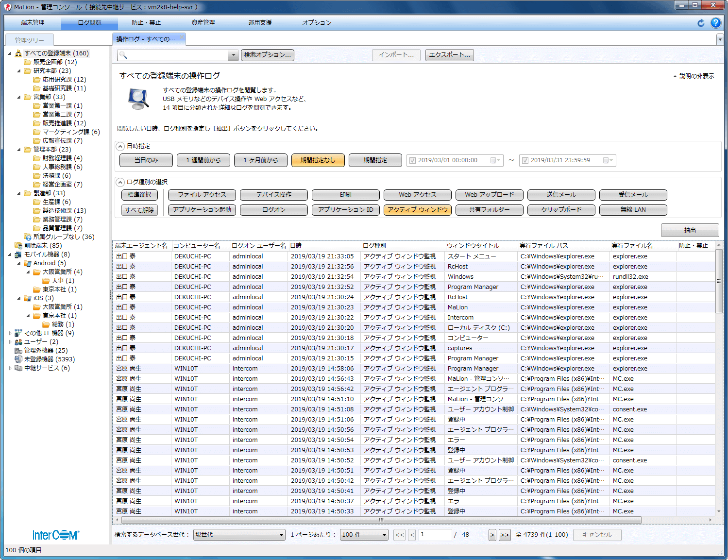 - 膨大な端末操作ログの中から、見たい種別を選択するだけで、関連するログが一覧表示できます。