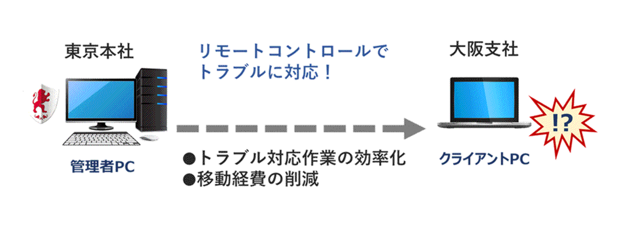管理者は自席より遠隔操作できるため、社内のPCトラブルに対する対応作業の効率化や移動経費の削減が可能となります。