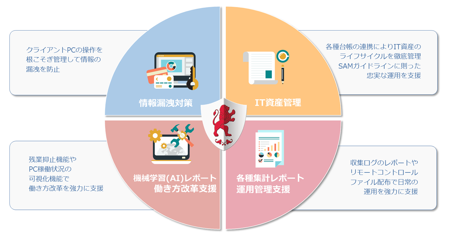 しかし、MaLionではこれらの機能をオールインワンで実装しているので、貴社内の情報セキュリティと資産管理体制について一貫した流れでのご提供が可能です。